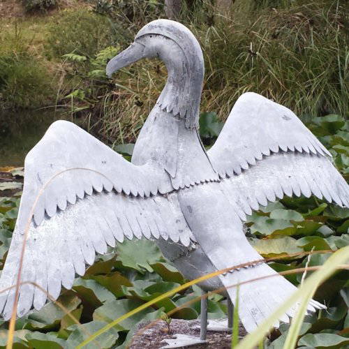 Waterbird A full- scale galvanized water bird standing on a wharf post with wings out-stretched basking in the sun. Artist: Bruce Young.